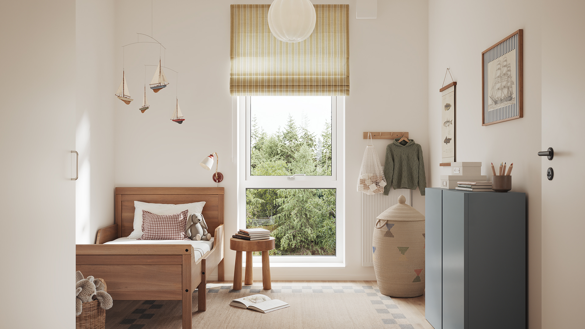 Upstairs you’ll find the home’s bedrooms, bright, timeless and well-proportioned. Each room includes built-in wardrobes from Marbodal for efficient storage. The rooms are designed to be flexible and can be used as bedrooms, guest rooms or a home office.